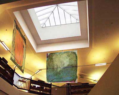 Fine Art Large scale transparent scrims add atmosphere and color to open spaces. In this simulated installation, abstract forms enhance a foyer featuring stairwell and skylight. The transparent hangings help define space and create a strong sense of place while assisting in wayfinding in large, complex public areas.