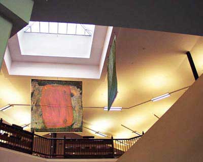 Fine Art Large scale transparent scrims add atmosphere and color to open spaces. In this simulated installation, abstract forms enhance a foyer featuring stairwell and skylight. The transparent hangings help define space and create a strong sense of place while assisting in wayfinding in large, complex public areas.